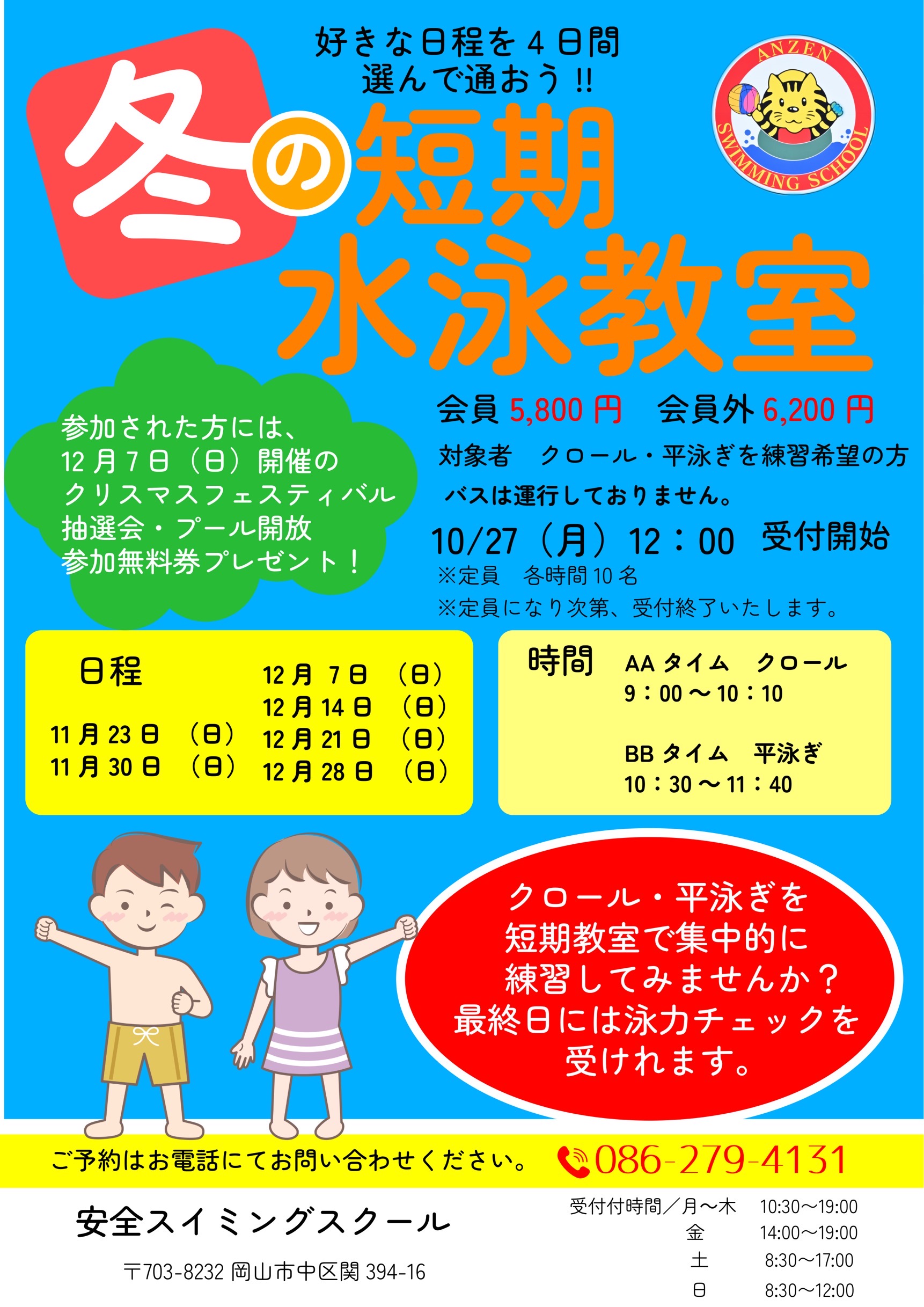 2025冬短期水泳教室 安全スイミング2025年冬の短期水泳教室のお知らせです🏊♀️ 『クロールと平泳ぎのレベルアップを目指そう!!』 短期集中で、水嫌いを克服❗️もっと泳げるように❗️ また、最終日は泳力チェックをおこないます👊 定員が各10名となりますので、お申し込みはお早めに💨 水泳で体温調整機能+免疫力アップして風邪を引きにくい身体を目指そう‼️